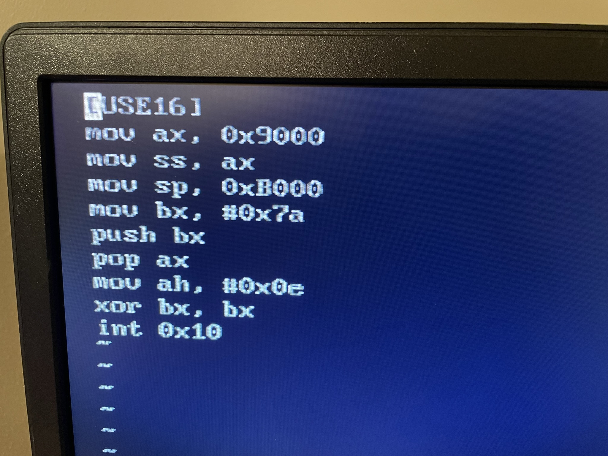 Here I've allocated a portion of system RAM for a stack, set the stack segment and stack pointer to memory addresses to initialize the memory address bounds. I then use push and pop which implicity use the current stack segment for saving of data and removing of data, I then call the BIOS interrupt to print what was pushed and popped off the stack to verify it works as expected. Stack Initialization and Usage Code